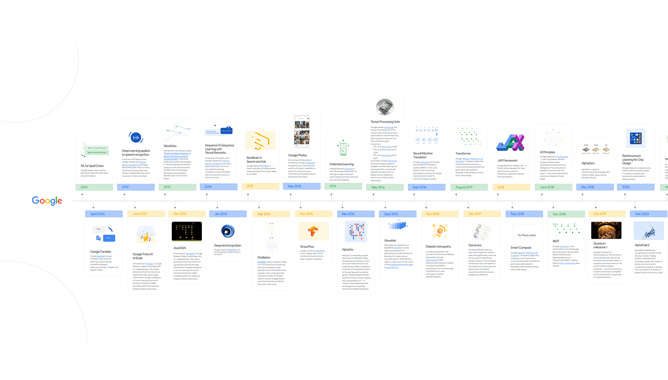 Google has been a driving force in Al development for over two decades. To showcase their leadership in this field, we created a public-facing interactive timeline as well as a toolkit for their internal marketing team. The timeline highlights over 50 milestones, represented by animated images, many created exclusively for this experience. This work celebrates Google's achievements in developing Al technology that benefits everyone.